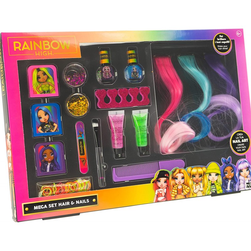 RAINBOW HIGH Hair & Nails: sentirsi una fashion girl di talento e creativa non è mai stato così facile! Con questo kit di extension, gel a crema, gessi colorati per capelli e smalti per le unghie puoi sviluppare “l’Arcobaleno Style”.