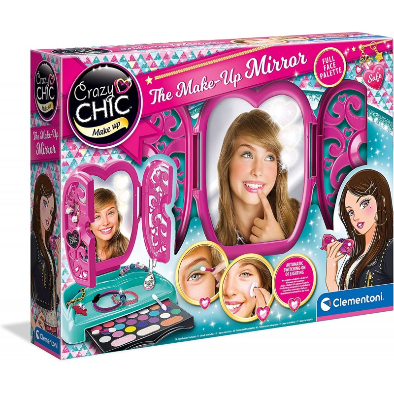 La specchiera contiene un ricco set di cosmetici con lucidalabbra, ombretti e fondotinta, ci sono anche applicatori e una spugnetta.
