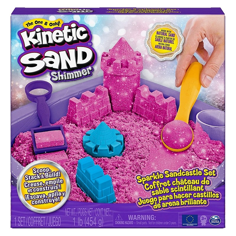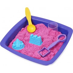 453 g di Kinetic sand rosa, 1 cucchiaio, 1 strumento sagomato, 1 formina per mura, 1 formina per torretta, 1 formina a cilindro, 1 vassoio per la sabbia.