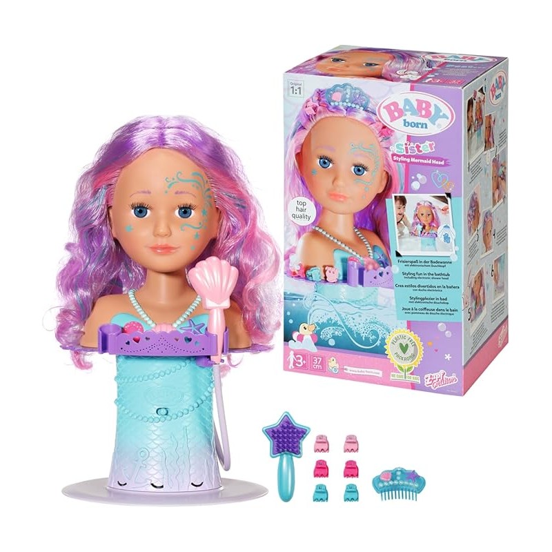 TESTINA A FORMA DI SIRENA - Fissa le ventose nella vasca così il tuo piccolo parrucchiere può mettersi al lavoro; giocare con l'acqua, lavare i capelli e pettinarli con la spazzola a forma di stella marina.