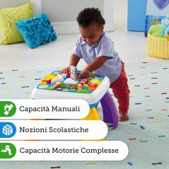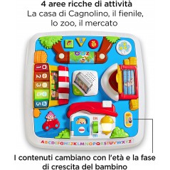 Include 1 tavolino musicale per bambini Ridi e Impara Fisher Price con 3 livelli di gioco, 4 simpatici posti da visitare, 9 luci e più di 120 canzoncine, melodie e frasi