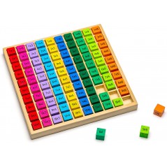 La confezione comprende una tavola di calcolo in legno, che contiene 10x10 cubetti colorati con i quesiti delle tabelline.