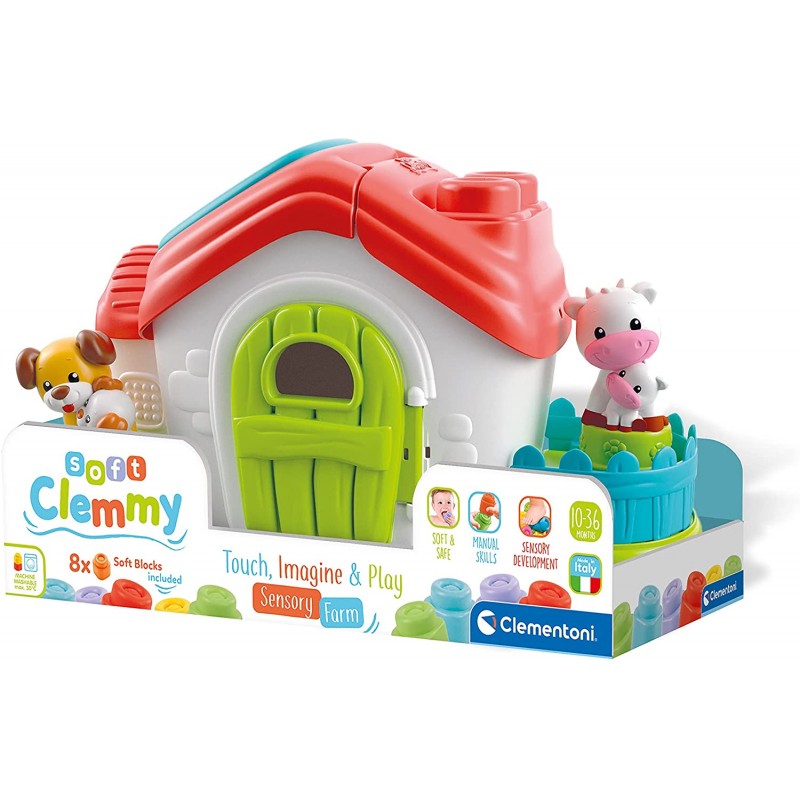 Un play set fattoria ricco di texture in rilievo; inserti morbidi tipici della linea Clemmy; tanti mattoncini e dei simpatici animali da fattoria.