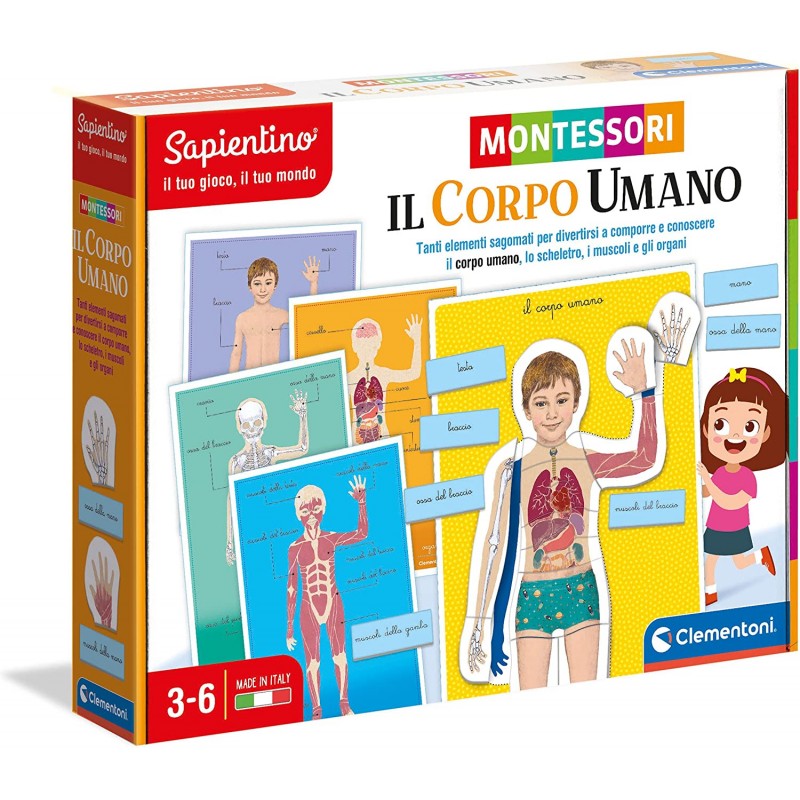 La confezione contiene un tabellone con la sagoma di un bambino su cui sovrapporre elementi sagomati in cartone che compongono le varie parti del corpo, così facendo potrà ricostruire il corpo visto dall'esterno, lo scheletro, i muscoli e gli organi interni.