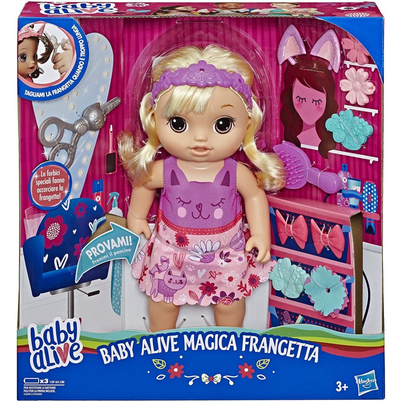 Parla a mamma e a papà - la bambola baby alive taglio e piega pronuncia oltre 35 suoni e frasi in lingua; sposta l'interruttore per farla parlare con mamma e papà