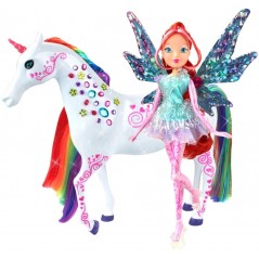 Winx Bloom versione magiaTynix con unicorno Elas. Winx Bloom alta 26 cm con corpo a 7 punti di articolazione: gambe e braccia pieghevoli. L’unicorno è personalizzabile con gioielli e tatuaggi e 2 fogli stickers inclusi.