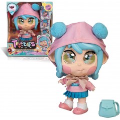 Vestita con un look romantico che include un maglione rosa decorato con un fiocco beige e un cappuccio con pompon blu in tinta con i suoi capelli;